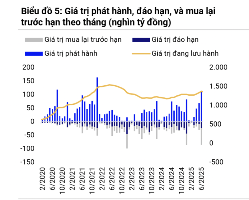 Diễn biến này phản ánh nỗ lực tái cơ cấu nợ của các Tổ chức phát hành nói chung khi thị trường có phần khởi sắc trở lại và mặt bằng lãi suất duy trì ở mức khá hấp dẫn trong nửa đầu năm 2025.